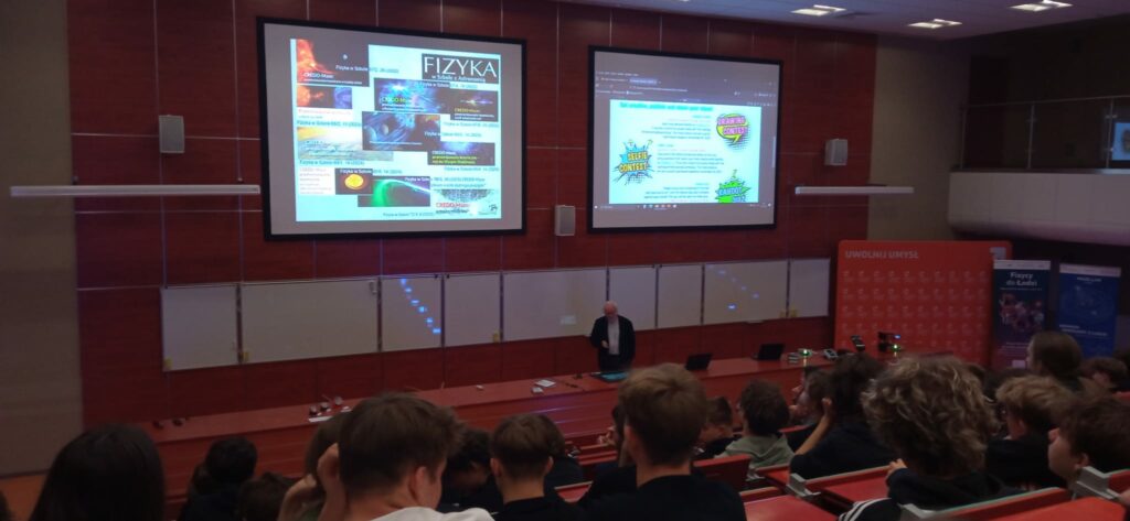 W dniu 13 listopada 2025 r. uczciliśmy Międzynarodowy Dzień Promieniowania Kosmicznego. Uczniowie klasy 2A z rozszerzeniem mat-fiz, poznali pochodzenie promieniowania kosmicznego, sposoby pomiarów i obserwacji teleskopami MAGIC, usłyszeli o promieniowaniu elektromagnetycznym, uczestniczyli w transmisji na żywo z obserwatorium La Palma w Hiszpanii. Niewątpliwie była to okazja do odkrycia czym zajmuje się współczesna fizyka. Wydarzenie dedykowane było młodzieży szkół średnich, organizatorem był Wydział Fizyki i Informatyki Stosowanej UŁ.